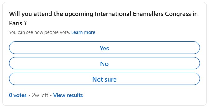 Please fill in my poll on LinkedIn about the upcoming 26th International Enamellers Congress in Paris via https://www.linkedin.com/feed/update/urn:li:activity:7284843408752300032
