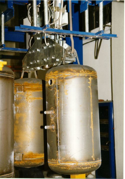 Its furnace conveyor was automatically loaded with powder enamel applied water tanks by means of a bespoke transfer device.