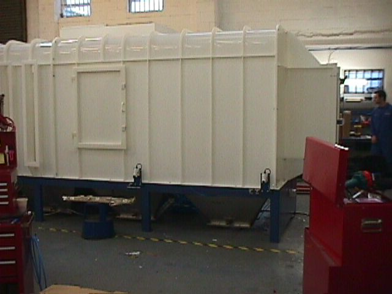 Hopperized powder booth base made of stainless steel with canopy made of polypropylene.