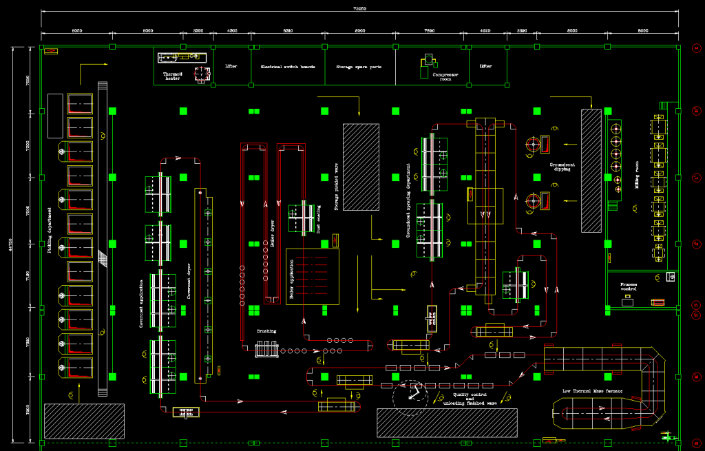 As you may see on the enameling plant layout below, the main challenge of this project was to fit all equipment between all these columns.